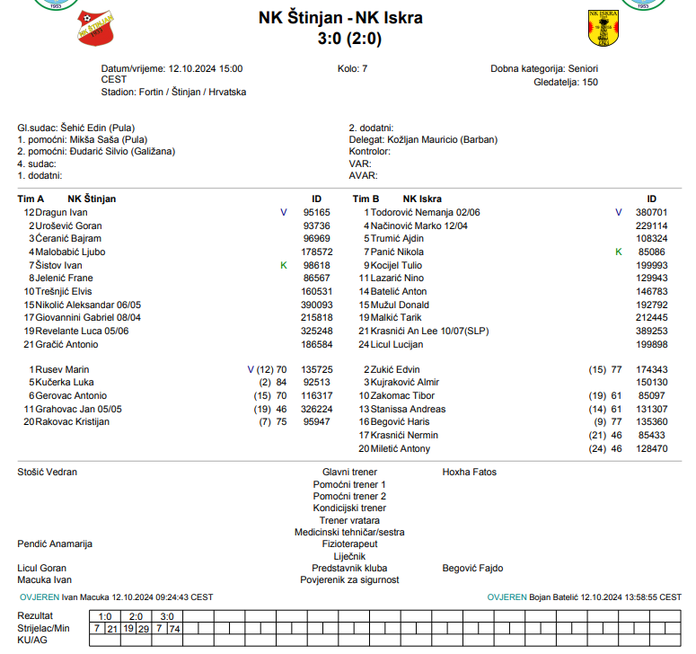 Na Fortinu, Štinjan je ostvario uvjerljivu pobjedu nad Iskrom rezultatom 3:0. Strijelci za domaći sastav bili su Ivan Šistov, koji je zabio dva gola (21′ i 74′), te Luca Revelante (29′). Iako je Iskra u nekim trenucima igre pokazivala određeni otpor, sreća je definitivno bila na strani Štinjana. Već kod prvog gola, udarac Šistova promijenio je smjer nakon što je okrznuo igrača Iskre, što je postavilo ton za daljnji tijek utakmice.