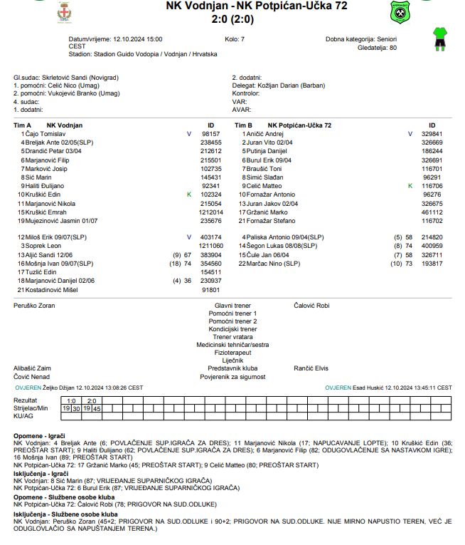 Na domaćem terenu u Vodnjanu, domaćini su odnijeli važnu pobjedu od 2:0 protiv Potpićana. Oba pogotka za domaćina postigao je Jasmin Mujezinović prvi nakon centaršuta Petra Drandića u 30. minuti, a drugi na ubačaj Emraha Kruškića tik prije poluvremena. Vodnjan je kontrolirao utakmicu, iako su gosti iz Potpićana pokazali solidnu igru s loptom.