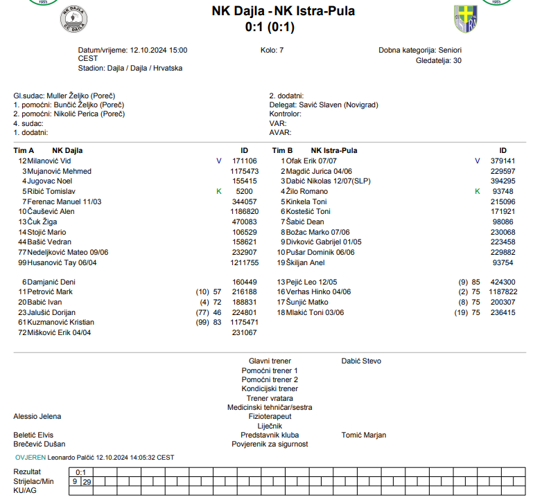U Dajli, domaća momčad nije uspjela iskoristiti svoje prilike. Dok su gosti iz Istre-Pula slavili minimalnom pobjedom od 1:0. Strijelac jedinog pogotka bio je Gabrijel Divković, koji je u 29. minuti sjajnim udarcem iz daljine pogodio suprotne rašlje. Istra-Pula, koja se bori za vrh tablice, taktički je odigrala zrelu utakmicu i zadržala bodove, dok je Dajla, iako dominantnija u dijelovima utakmice, ostala bez bodova. Domaćini su imali nekoliko dobrih prilika, a borbenost i trud na terenu nije izostala, posebno kod igrača koji su igrali unatoč ozljedama. Ipak, gostujuća momčad pokazala je zašto su trenutno drugi na ljestvici. Prve Istarske ŽNL