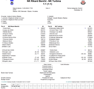 Utakmica između Turbine i Rikarda Benčića protekla je vrlo glatko jer su već u prvom poluvremenu postignuti svi ključni golovi. U 30. minuti, Marko Barić svojim pogotkom dovodi Rikard Benčić u vodstvo. Samo šest minuta kasnije, Marin Car izjednačuje rezultat na 1-1, čime vraća Turbinu u igru. Drugo poluvrijeme nije donijelo veće promjene, a iako su obje momčadi tražile pobjednički gol, utakmica je završila bez daljnih pogotka. Tako su obje ekipe osigurale po bod.