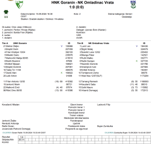 Prvo poluvrijeme proteklo je relativno u mirnom tonu, bez velikih prilika i drame na terenu. Međutim, drugi dio utakmice donio je preokret kada je igrač Goranina, Branimir Brelih zaradio crveni karton, ostavljajući svoju ekipu u nepovoljnom položaju, no Anton Lalić preuzima kontrolu kada u 70′ minuti zabija ključni pogodak koji je bio presudan za njegovu, gostujuću ekipu koja je nakon toga osigurala tri vrijedna boda, unatoč pritisku domaćina.