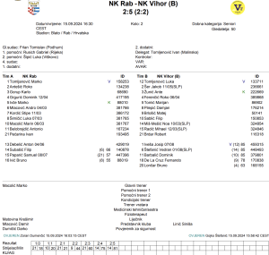 Nogometni klub Rab doživio je težak poraz na domaćem terenu od Vihora rezultatom 2-5, unatoč obećavajućem početku utakmice. Ivan Pećarina doveo je Rab u vodstvo u 18. minuti, no Filip Sablić ubrzo izjednačuje na 1-1. Pečarina ponovno preuzima odgovornost i u slijedećoj minuti vraća rab u vodstvo s 2-1. Ipak, neposredno prije kraja prvog poluvremena, Matej Brlošić postiže pogodak u 44. minuti, čime Vihor izjednačava na 2-2 i donosi napetu situaciju na odmor. U drugom poluvremenu, Vihor je potpuno dominirao – Robert Brdar postiže gol u 60.minuti, dok Matešić sjajnom igrom u 75. i 81. minuti postavlja konačnih 5-2. Poseban trenutak utakmice bio je debi mladog Samuela Paprića za prvu momčad NK Raba.