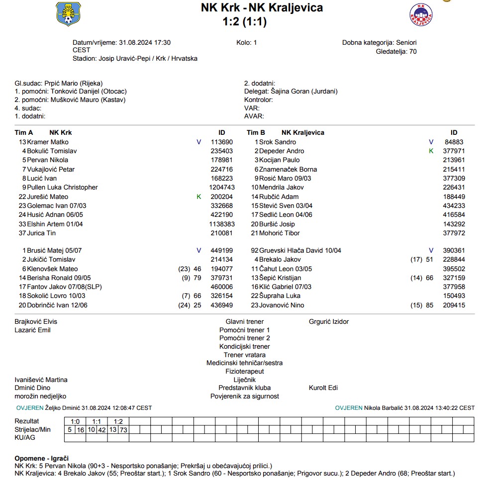 Krk je na domaćem terenu doživio poraz od Kraljevice rezultatom 1:2. Iako je izgledalo da će Krk doći do pobjede, s obzirom na to da je Nikola Pervan u 16. minuti postigao prvi gol na utakmici, gosti su se uspjeli oporaviti. Prije kraja prvog poluvremena, točnije u 42. minuti, Jakov Mendrila izjednačio je rezultat. Drugo poluvrijeme također je bilo dinamično, no domaćini su primili odlučujući gol u 73. minuti, koji je postigao Kristijan Šepić. Krk je neočekivano izgubio, što pokazuje da će trener Elvis Brajković imati još posla s momčadi koja je prošle sezone igrala u Drugoj NL.