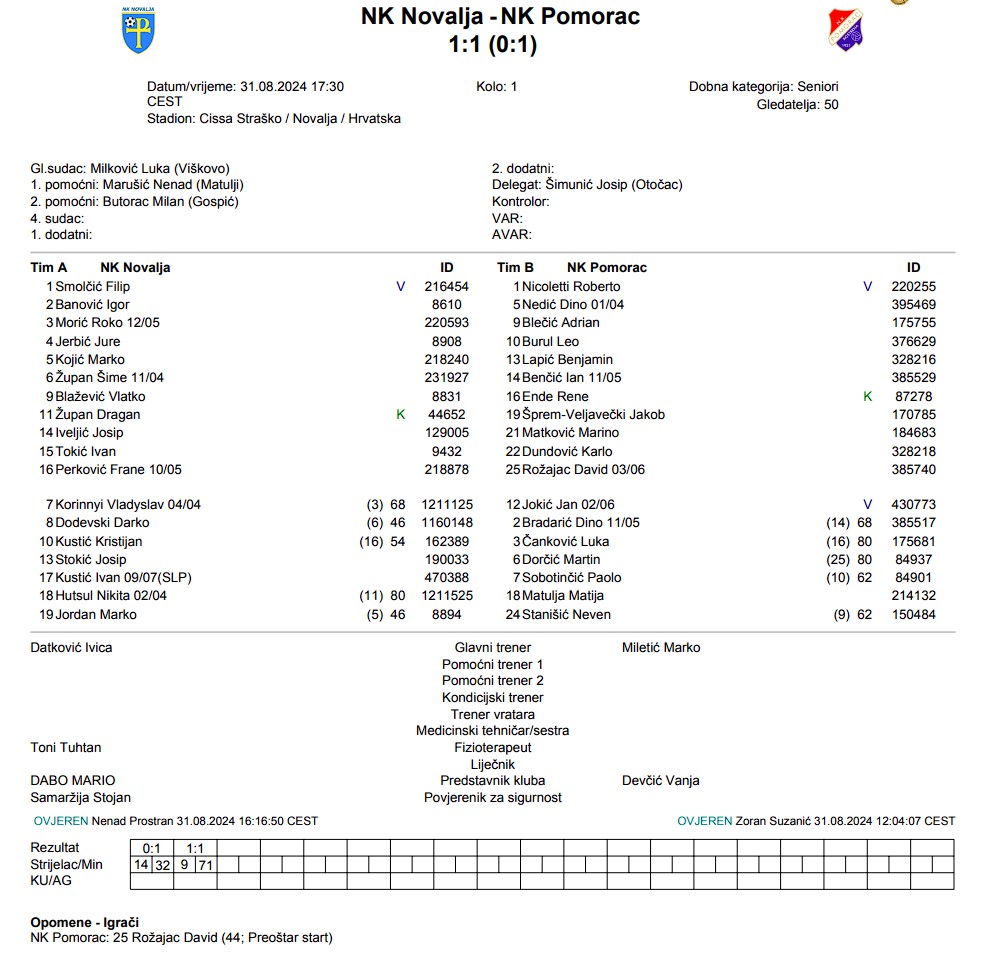 – Utakmica se igrala po jako teškom vremenu, ekipa Novalje nam je bila nepoznanica, ali ipak smo dobro ušli u utakmicu, nametnuli svoju volju i kreirali dovoljno šansi da zabijemo više od jednog gola. Protivnički golman je reagirao vrhunski na nekoliko lopti. I u drugom dijelu smo imali situacije za završiti utakmicu, tražili smo drugi gol, bili dobri na drugoj lopti. Zadnjih trideset minuta se utakmica otvorila s protivničke strane, imali su i oni neke situacije pred našim golom. Dobro smo reagirali na primljeni gol. Tražili smo tri boda, no danas nam se nije vratilo, ali nadam se da hoće već u utorak – rekao je trener Pomorca Marko Miletić.