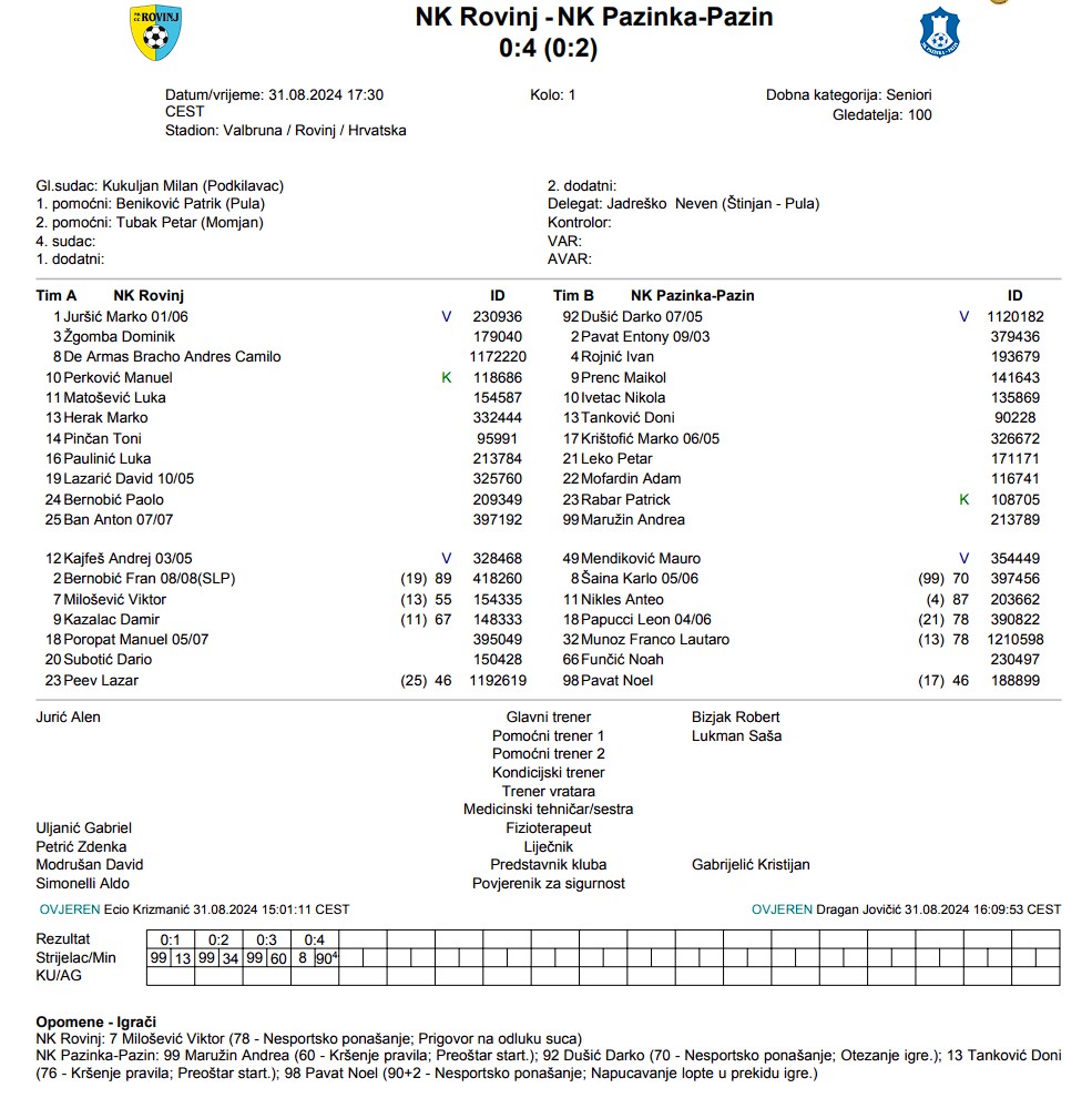NK Rovinj doživio je težak poraz na domaćem terenu, izgubivši s uvjerljivih 0:4 od Pazinke. Andrea Maružin doveo je goste u vodstvo već u 13. minuti, a potom u 34. minuti povećao rezultat na 0:2, s kojim se otišlo na poluvrijeme. Iako je Rovinj imao nekoliko prilika, nisu uspjeli ozbiljnije zaprijetiti golu Pazinke. Drugo poluvrijeme započelo je nešto mirnije, sve dok Maružin u 60. minuti nije postigao svoj treći gol. Konačnih 0:4 postavio je mladi Karlo Šaina, ostavljajući Rovinj s gorčinom nakon poraza u istarskom derbiju u prvom kolu.