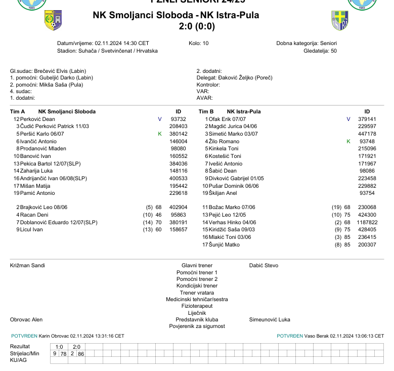 U Svetvinčentu je NK Smoljanci Sloboda dočekao NK Istru-Pula. Domaćini su uspjeli preokrenuti utakmicu u drugom poluvremenu zahvaljujući golovima Ivana Licula u 78. minuti i Lea Brajkovića u 86. minuti. Ekipa Smoljanci Slobode pokazala je dobru fizičku spremu i koncentraciju u ključnim trenucima utakmice, čime su se izjednačili s NK Vodnjan na drugom mjestu ljestvice s 21 bodom, dok je NK Istra-Pula ostala na četvrtom mjestu s 17 bodova. Istarska