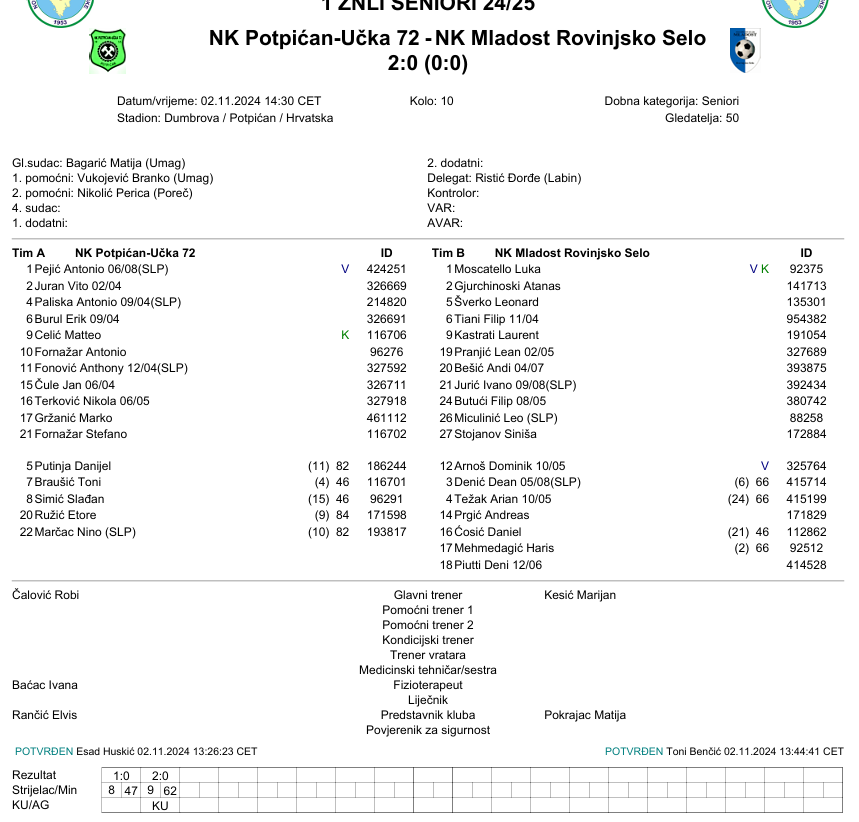U Potpićnu je NK Potpićan-Učka 72 ugostio NK Mladost Rovinjsko Selo i također slavio pobjedu od 2:0. Nakon mirnog prvog dijela, Potpićan je odmah po povratku na teren postigli pogodak. Slađan Simić, koji je ušao početkom drugog poluvremena, zatresao je mrežu gostiju već u 47. minuti. Nakon toga, Matteo Celić uspješno je realizirao kazneni udarac u 62. minuti za konačnih 2:0. Domaćini su zadržali prednost i time zadržali solidnu poziciju u sredini tablice s 13 bodova. Susret u Potpićnu obilježen je brojnim opomenama i isključenjima na strani NK Mladost Rovinjsko Selo. Primili su čak sedam opomena, uključujući dva crvena kartona.
