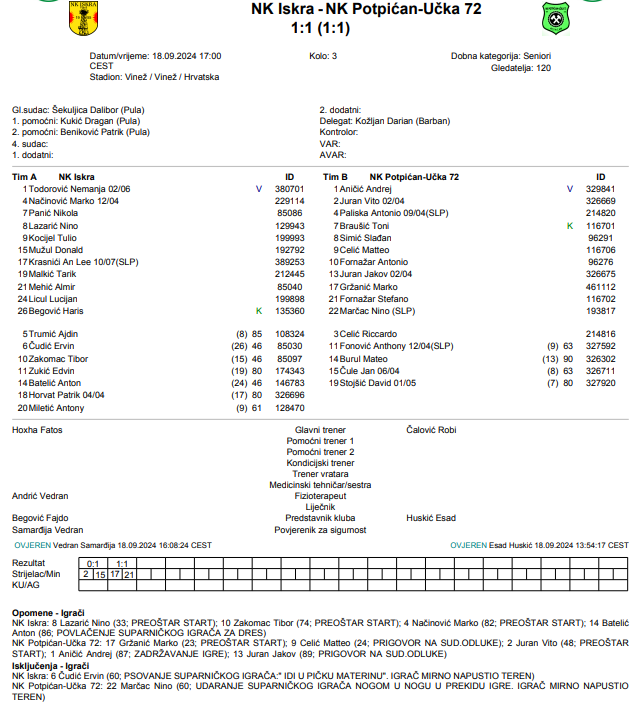 U Vinežu su Iskra i Potpićan-Učka 72 podijelili bodove u izjednačenom dvoboju koji je završio rezultatom 1:1. Gosti su poveli već u 15. minuti golom Vita Jurana, no Iskra je brzo odgovorila pogotkom An Lee Krasnićija u 21. minuti. Iako je Iskra imala inicijativu i više prilika, nisu uspjeli postići pobjednički pogodak.