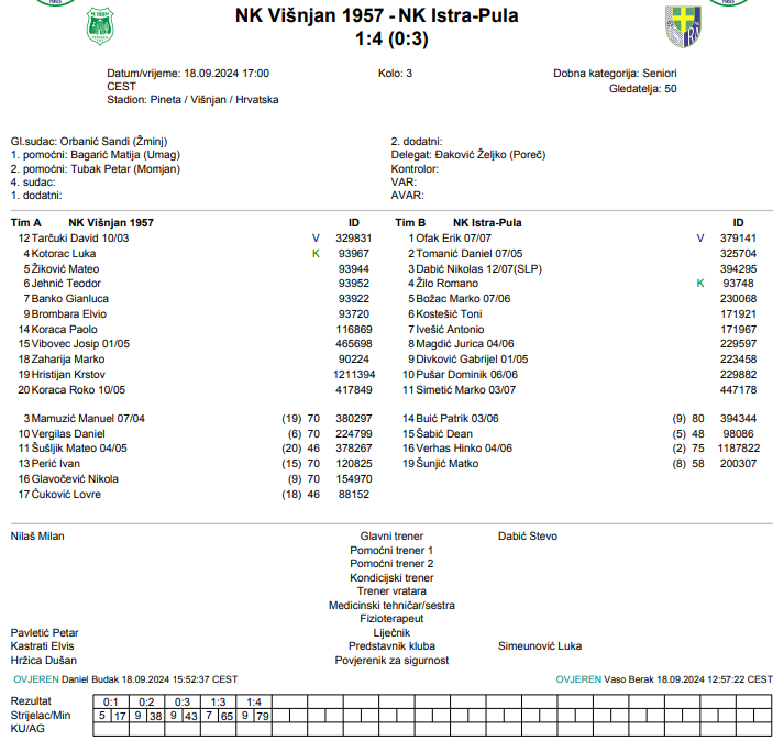 Pulska Istra nastavila je svoju dominaciju u ligi, uvjerljivo pobijedivši Višnjan s 4:1. Marko Božac postigao je prvi pogodak već u 17. minuti, čime je postavio ton utakmice. Gabrijel Divković bio je ključni igrač, briljirajući s tri pogotka (38’, 43’, 79’) i osiguravši svojoj momčadi treću pobjedu u isto toliko utakmica ove sezone. Iako je Višnjan uspio smanjiti rezultat preko Gianluce Banka u 65. minuti, nisu imali dovoljno snage i kvalitete da ozbiljnije ugroze dobro organiziranu i dominantnu Istru, koja i dalje pokazuje superiornost u ovoj sezoni.