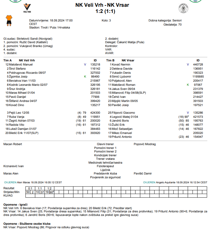 Vrsar je upisao važnu gostujuću pobjedu protiv Velog Vrha rezultatom 2:1, i to na dramatičan način. Gosti su poveli već u 2. minuti preko Josipa Pavišića, što im je dalo rani zamah. Domaćini su se vratili u igru pogotkom Mihaela Marasa u 37. minuti, ali prava drama uslijedila je u samoj završnici. Antonio Pršurić postigao je pobjednički pogodak u 90+4. minuti, osiguravši tako Vrsaru prvi trijumf u novoj sezoni, i to na samom kraju utakmice.