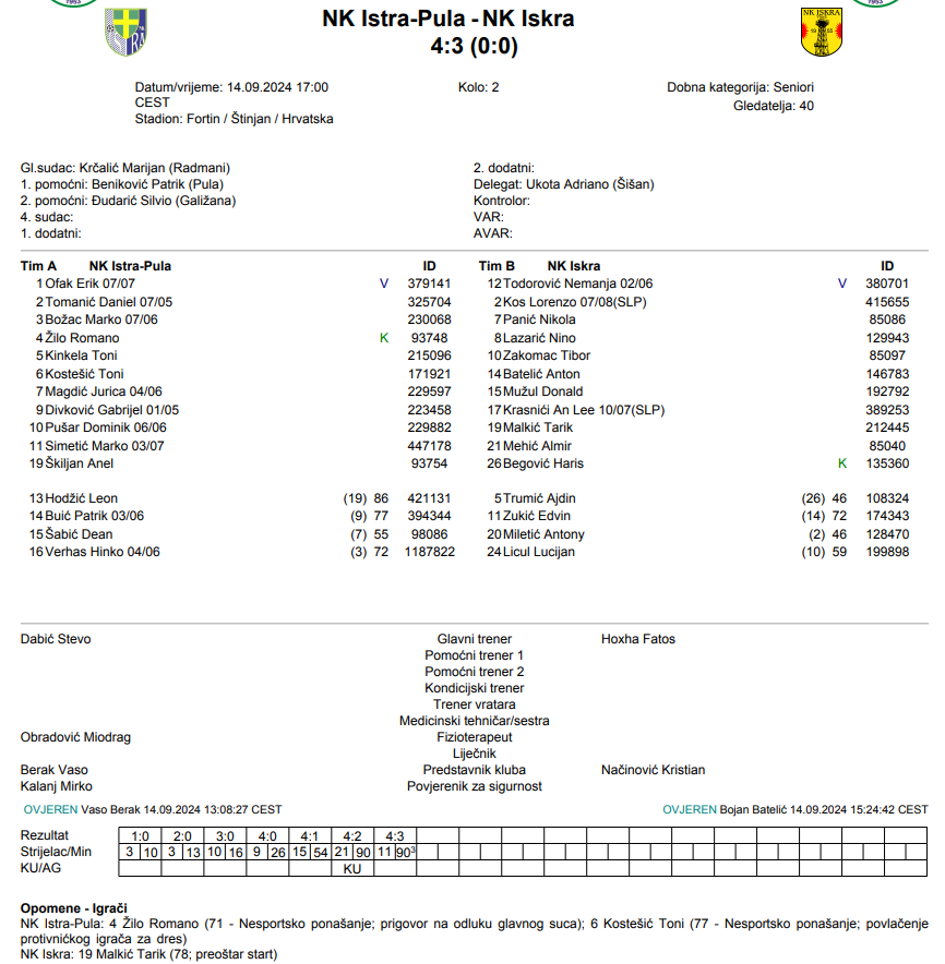 Istra Pula je sjajno otvorila utakmicu protiv NK Iskre Vinež i već u prvih pola sata postigla četiri gola. Marko Božac bio je dvostruki strijelac za domaćine, zabivši u 10. i 13. minuti, dok su Dominik Pušar i Gabrijel Divković sa svojim pogocima u 16. i 26. minuti osigurali ugodnu prednost.