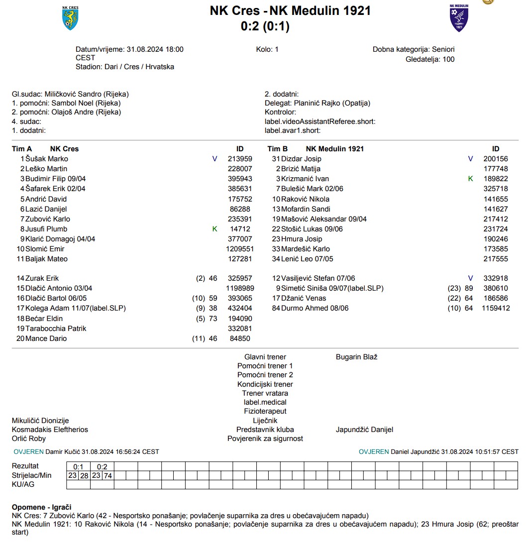Iako se često pretpostavlja da će se Medulinci ove sezone boriti za ostanak u ligi, njihova današnja pobjeda u gostima protiv Cresa ima poseban značaj. Junak utakmice bio je Josip Hmura, koji je najprije u 28. minuti volejem poslao loptu u mrežu za vodstvo 0:1. Nakon nekoliko promašaja Medulinskih igrača, Hmura je u 74. minuti srušio sve nade domaćina. Presjekao je loptu u gostujućoj obrani, sjurio se prema golu i lijevom nogom zabio za konačnih 0:2. Cres je tako prvu utakmicu kola na domaćem terenu s novim trenerom započeo porazom, dok će Medulinci ovu pobjedu itekako proslaviti.