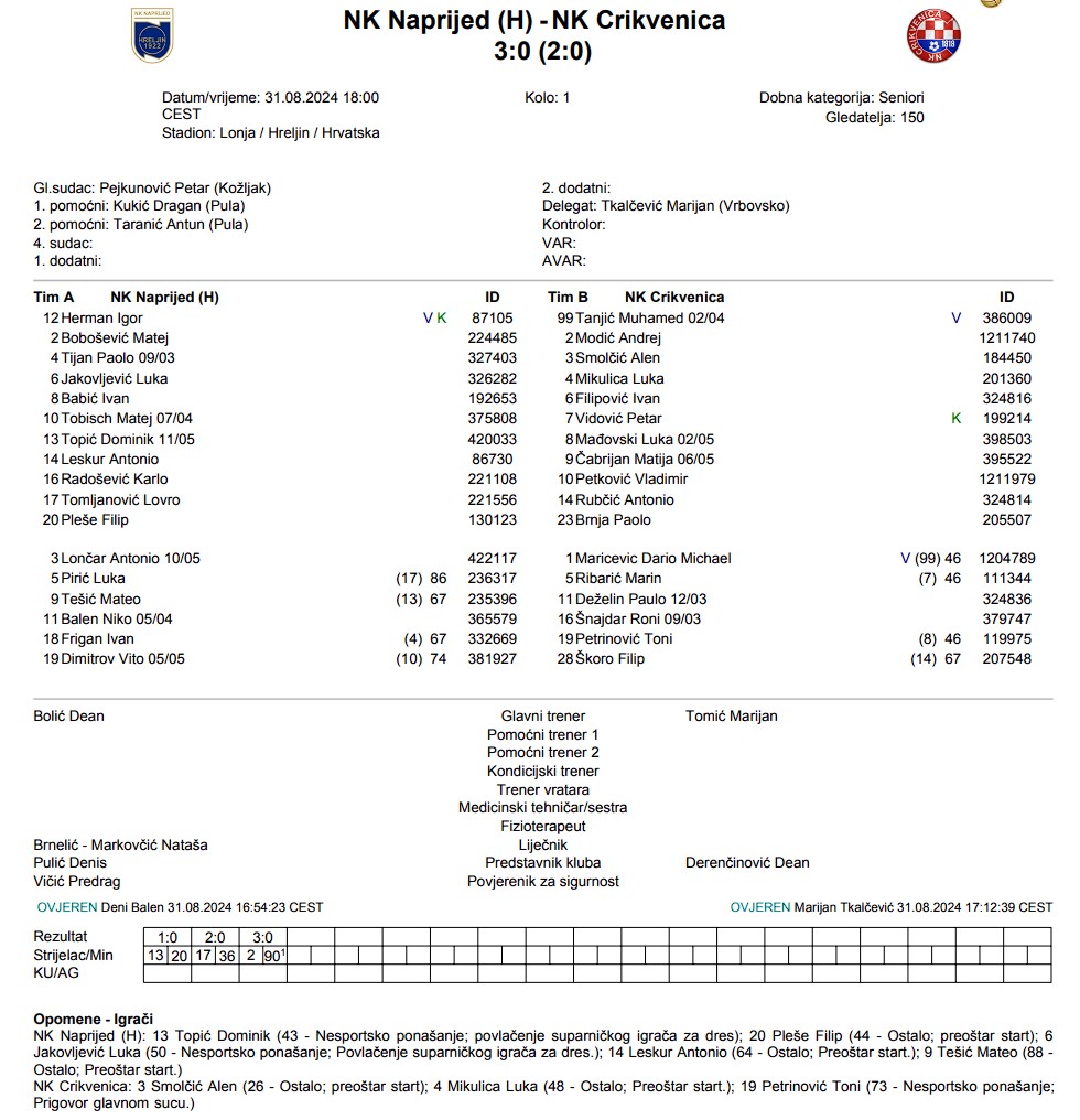 Naprijed je na domaćem terenu ostvario pobjedu protiv Crikvenice. Domaćini su poveli u 20. minuti golom Dominika Topića, a prednost su povećali na 2:0 golom Lovra Tomljanovića u 36. minuti. Iako je Naprijed u drugom poluvremenu naišao na kratku krizu, obrana je bila čvrsta i rezultat je ostao 2:0 prije samoga kraja utakmice, kada Matej Bobošević postiže treći gol u 91. minuti, čime je osigurao pobjedu Naprijeda 3:0, koji je osvojio sva tri boda u prvom kolu.