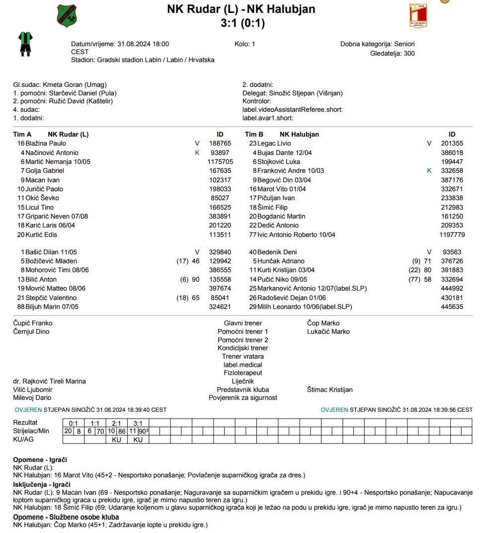 Nogometaši labinskog Rudara ostvarili su zasluženu pobjedu u otvaranju nove sezone. Iako je Halubjan u prvom poluvremenu pokazao bolju igru i poveo golom Martina Bogdanića, domaća momčad pod vodstvom trenera Franka Čupića probudila se u drugom poluvremenu i preokrenula utakmicu u svoju korist. Rudar je preuzeo inicijativu, dok su se gosti organizirano branili. Ključni trenutak dogodio se u 69. minuti, kada je Filip Šimić oštro faulirao Ivana Macana i zbog toga dobio crveni karton. Rudar je brzo iskoristio brojčanu prednost, a Nemanja Martić je u 70. minuti izjednačio na 1:1. U tom trenutku postalo je jasno da će Halubjan teško izbjeći poraz. Rudar je do pobjede došao u završnici utakmice zahvaljujući dvama jedanaestercima: Paolo Juričić je realizirao prvi, dok je Ševko Okić postavio konačnih 3:1. Pred kraj utakmice, Macan je također dobio drugi žuti karton zbog čega će propustiti utakmicu drugoga kola.